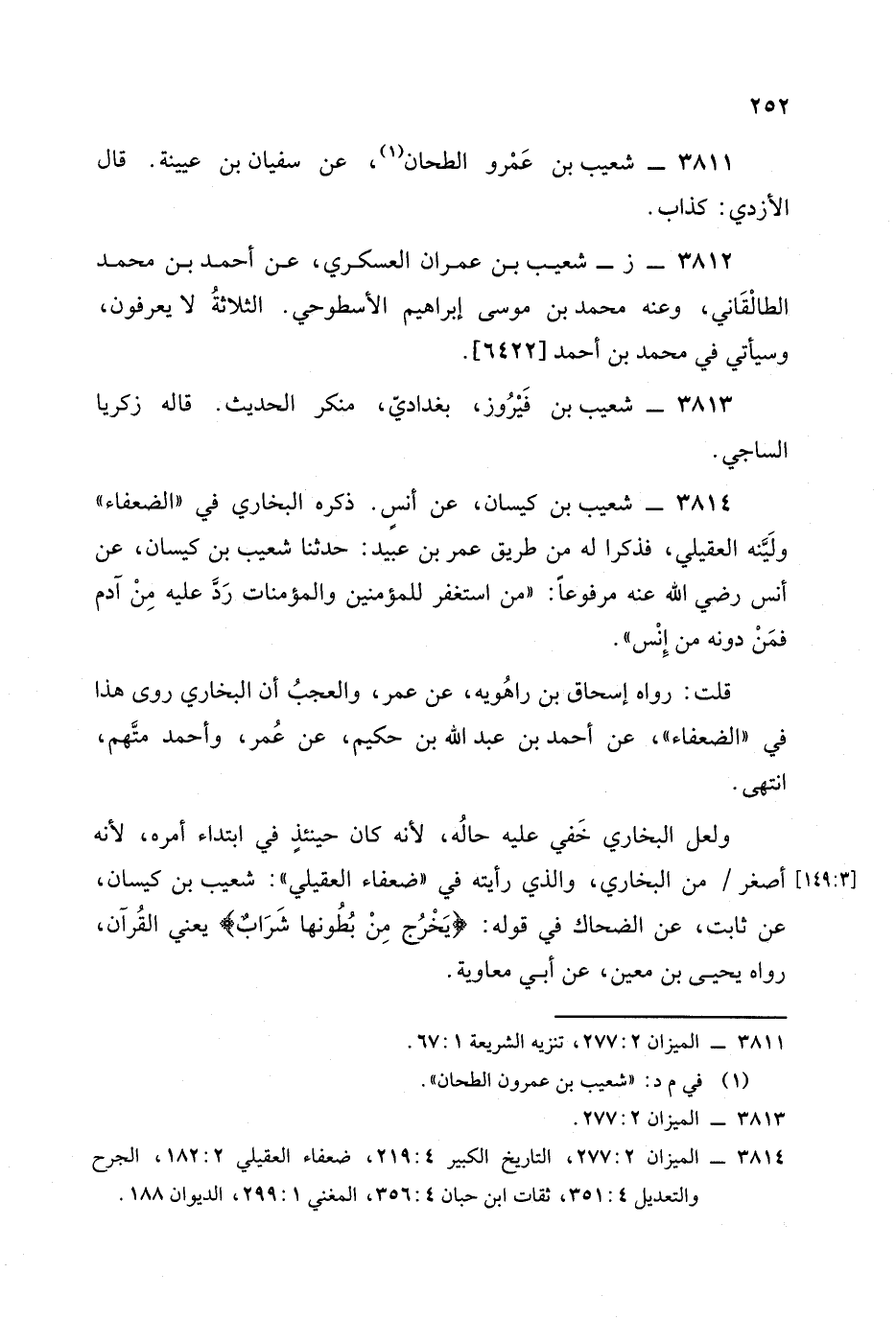 ولعل البخاري خفي عليه حاله لأنه كان حينئذ في ابتداء أمره لأنه أصغر من البخاري والذي رأيته في ضعفاء العقيلي شعيب بن كيسان عن ثابت عن الضحاك في قوله {يخرج من بطونها شراب} يعني القرآن.