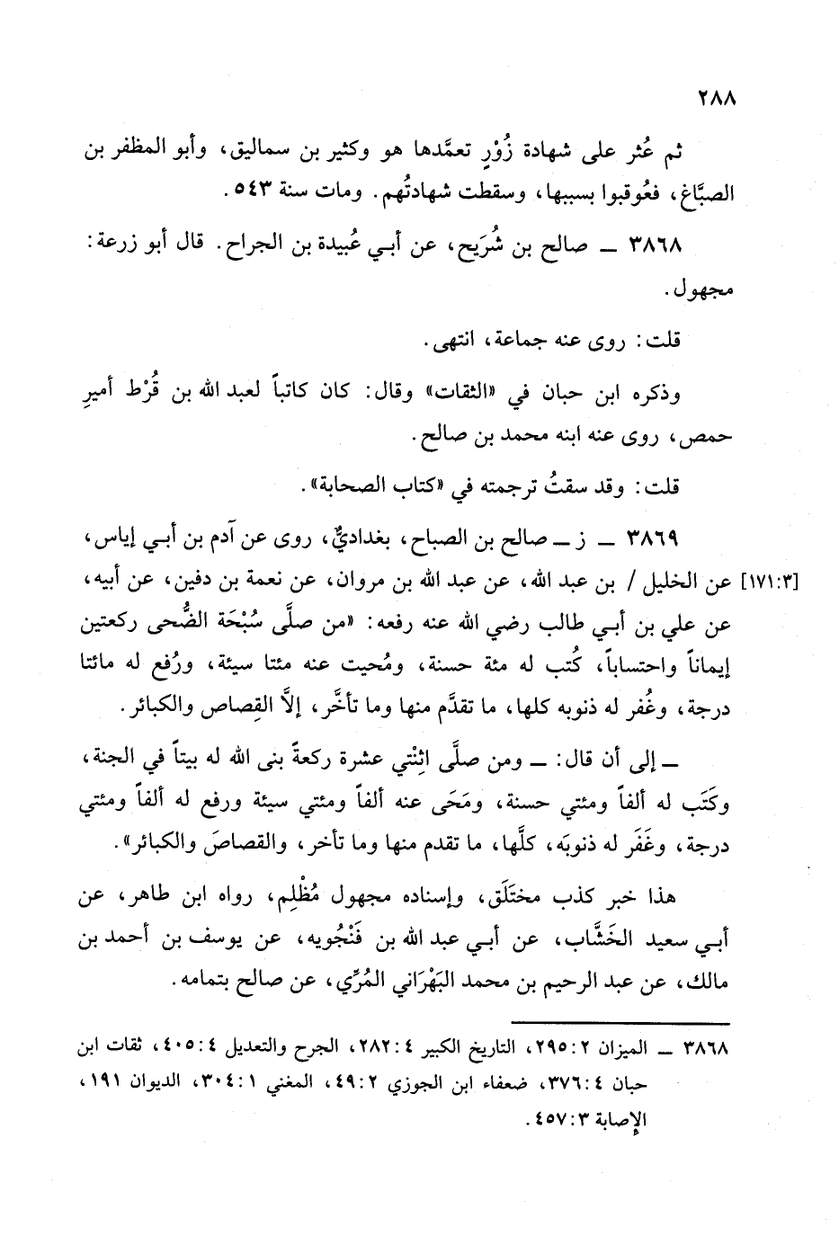 روى عن آدم بن أبي إياس عن الخليل بن عبد الله، عَن عَبد الله بن مروان عن نعمة بن دفين، عَن أبيه، عَن عَلِيّ بن أبي طالب رضي الله عنه رفعه: من صلى سبحة الضحى ركعتين إيمانا واحتسابا كتب له مِئَة حسنة ومحيت عنه مئتا سيئة ورفع له مئتا درجة وغفر له ذنوبه كلها ما تقدم منها وما تأخر إلا القصاص والكبائر.