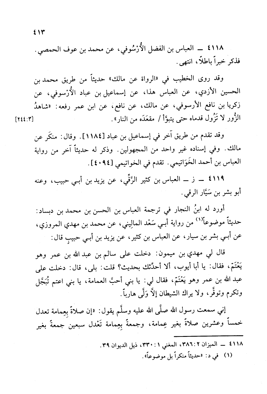 وقد روى الخطيب في الرواة عن مالك حديثا من طريق محمد بن الحسين الأزدي عن العباس هذا عن إسماعيل بن عباد الأرسوفي عن زكريا بن نافع الأرسوفي عن مالك عن نافع، عَنِ ابن عمر رفعه: شاهد الزور لا تزول قدماه حتى يتبوأ مقعده من النار.