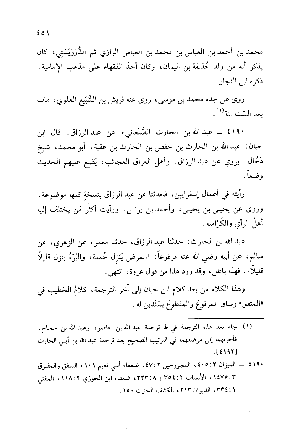 وهذا الكلام من بعد كلام ابن حبان إلى آخر الترجمة كلام الخطيب في المتفق وساق المرفوع والمقطوع بسندين له. -[452]-