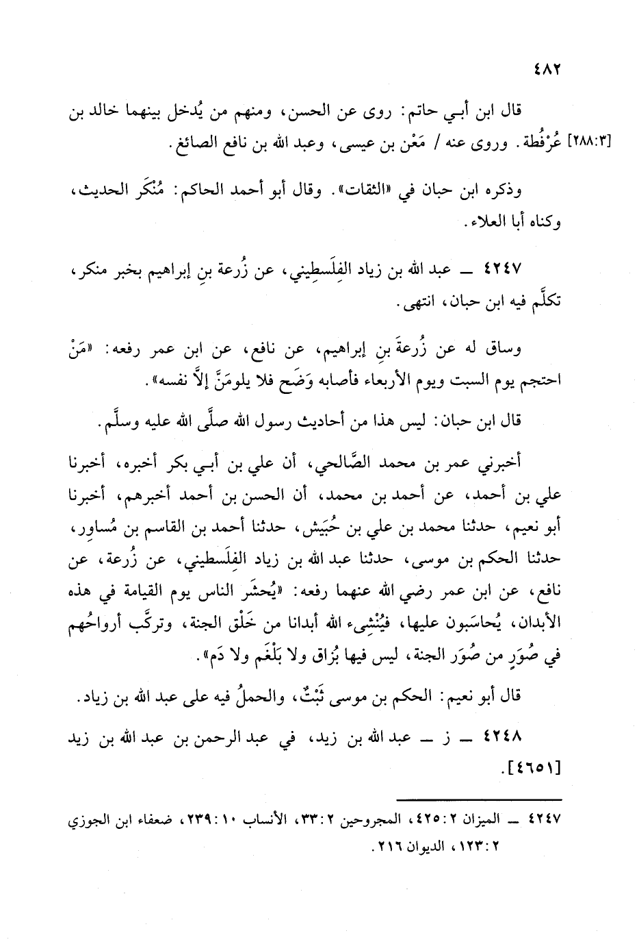 أخبرني عمر بن محمد الصالحي أن علي بن أبي بكر أخبره أخبرنا علي بن أحمد عن أحمد بن محمد أن الحسن بن أحمد أخبرهم أخبرنا أبو نعيم , حَدَّثَنا محمد بن علي بن حبيش , حَدَّثَنا أحمد بن القاسم بن مساور , حَدَّثَنا الحكم بن موسى , حَدَّثَنا عبد الله بن زياد الفلسطيني عن زُرْعَة، عَن نافع، عَنِ ابن عمر رضي الله عنهما رفعه: يحشر الناس يوم القيامة في هذه الأبدان يحاسبون عليها فينشىء الله أبدانا من خلق الجنة وتركب أرواحهم في صور من صور الجنة ليس فيها بزاق، وَلا بلغم، وَلا دم.