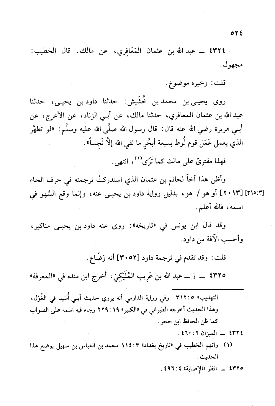 روى يحيى بن محمد بن خشيش حدثنا داود بن يحيى , حَدَّثَنا عبد الله بن عثمان المعافري , حَدَّثَنا مالك، عَن أبي الزناد عن الأعرج، عَن أبي هريرة رضي الله عنه قال: قال رسول الله صَلَّى الله عَلَيْهِ وَسَلَّمَ: لو تطهر الذي يعمل عمل قوم لوط بسبعة أبحر ما لقى الله إلا نجسا.