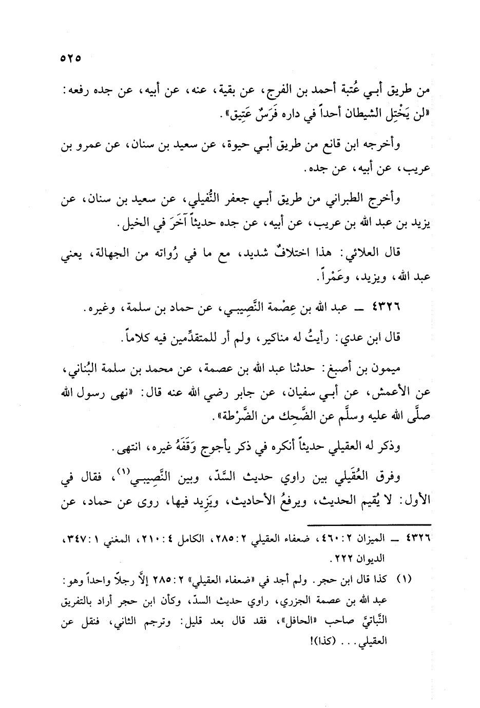 وفرق العقيلي بين راوي حديث السد وبين النصيبي فقال في الأول: لا يقيم الحديث ويرفع الأحاديث ويزيد فيها روى عن حماد عن عاصم، عَن أبي صالح، عَن أبي هريرة رفعه: إن يأجوج ومأجوج يحفرون السد حتى إذا أمسوا ... الحديث. -[526]-