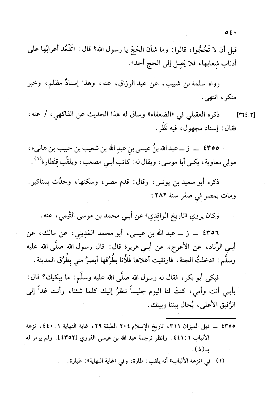 عن مالك، عَن أبي الزناد عن الأعرج، عَن أبي هريرة قال: قال رسول الله صَلَّى الله عَلَيْهِ وَسَلَّمَ: دخلت الجنة فارتقيت أعلاها فلأنا بطرقها أبصر مني بطرق المدينة فبكى أبو بكر فقال له رسول الله صَلَّى الله عَلَيْهِ وَسَلَّمَ: ما يبكيك؟ قال: بأبي أنت وأمي كنت لنا اليوم جليسا ننظر إليك كلما شئنا وأنت غدا إلى الرفيق الأعلى يحال بيننا وبينك. -[541]-