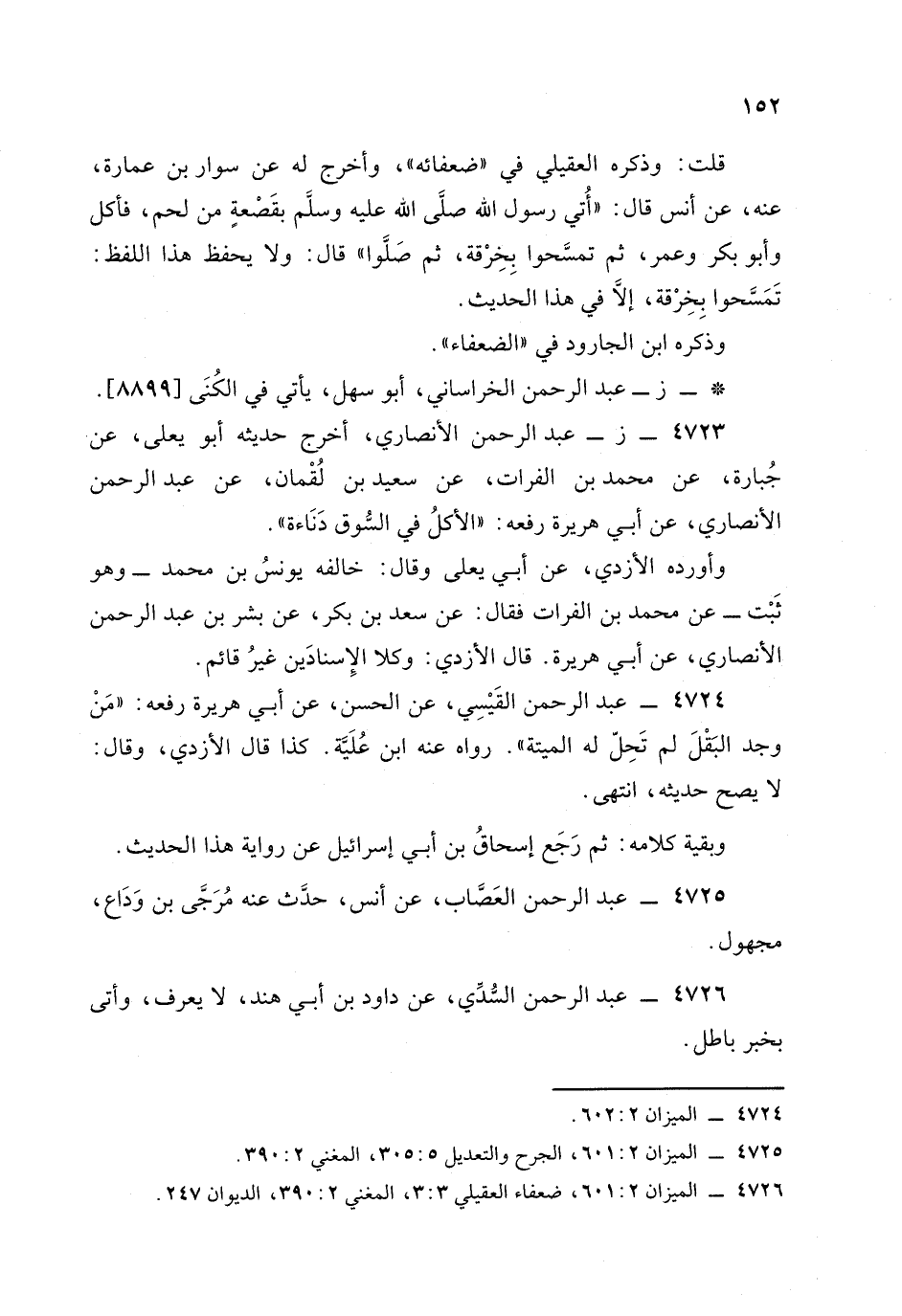 وأظن أن محمد بن مروان يكنى أبا عبد الرحمن فوقع في رواية العقيلي أخبرنا أبو عبد الرحمن السدي وسقط من عنده (أبو) فبقيت عبد الرحمن وتبين بهذا أن لا وجود لصاحب هذه الترجمة على أن محمد بن مروان لم ينفرد بل تابعه عبد الملك بن الخطاب وعبد العزيز بن الحسن بن دينار وله شاهد من حديث علي في مستدرك الحاكم.