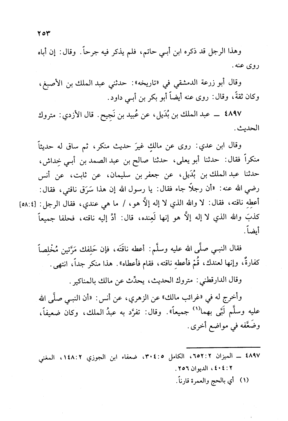وأخرج له في "غرائب مالك"، عَن الزُّهْرِيّ، عَن أنس أن النبي صلى الله عليه وسلم لَبَّى بِهما جميعا. وقال: تفرد به عبد الملك وكان ضعيفا وضعفه في مواضع أخرى. -[254]-