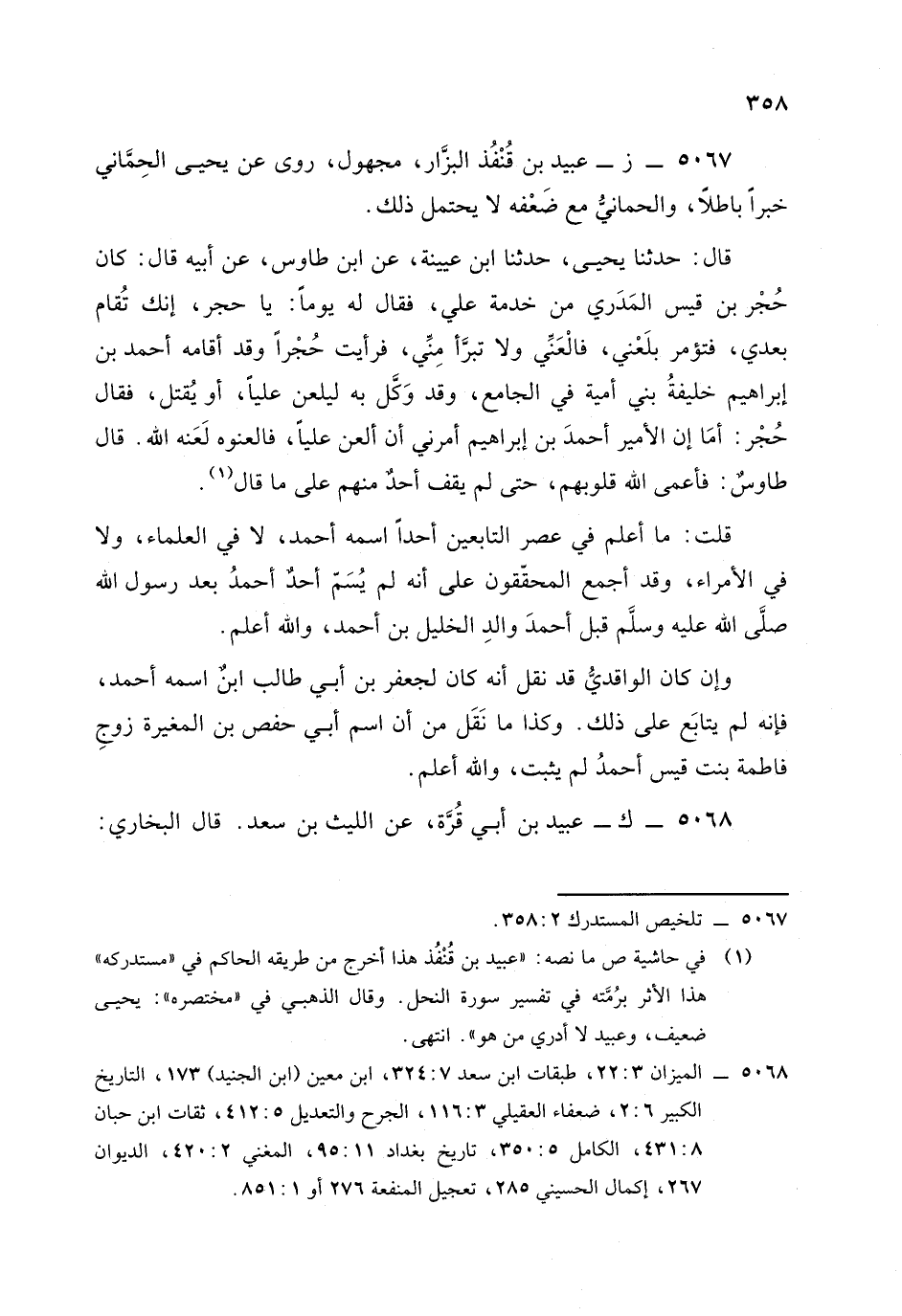 قال: حدثنا يحيى , حدثنا ابن عيينة، عَنِ ابن طاوُوس، عَن أبيه قال: كان حجر بن قيس المدري من خدمة علي فقال له يوما: يا حجر إنك تقام بعدي فتؤمر بلعني فالعني، وَلا تبرأ مني فرأيت حجرا وقد أقامه أحمد بن إبراهيم خليفة بني أمية في الجامع وقد وكل به ليلعن عَلِيًّا، أو يقتل فقال حجر: أما إن الأمير أحمد بن إبراهيم أمرني أن ألعن عَلِيًّا فالعنوه لعنه الله.