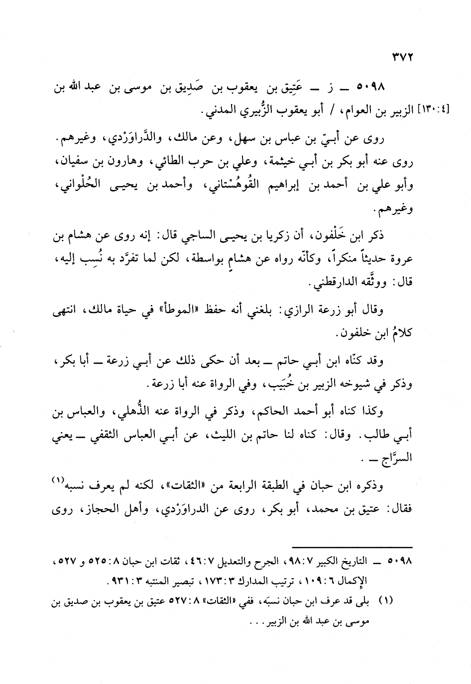 5098 - (ز): عتيق بن يعقوب بن صديق بن موسى بن عبد الله بن الزبير بن العوام أبو يعقوب الزبيري المدني.