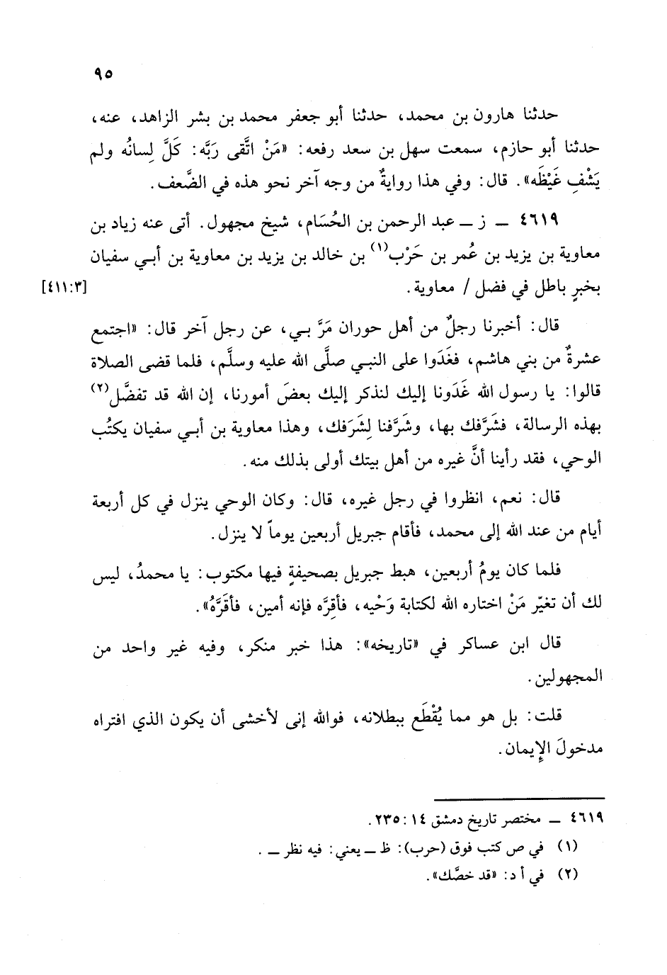 قال ابن عساكر في تاريخه: هذا خبر منكر وفيه غير واحد من المجهولين.