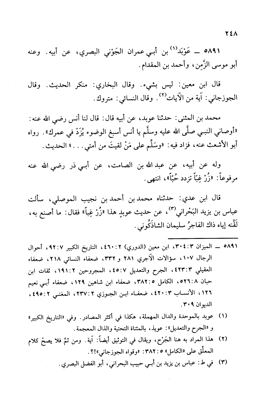 قال ابن عَدِي: حدثناه محمد بن أحمد بن نجيب الموصلي سألت عباس بن يزيد البحراني عن حديث عوبد هذا: زر غبا. فقال: ما أصنع به , لقنه إياه ذاك الفاجر سليمان الشاذكوني. -[249]-