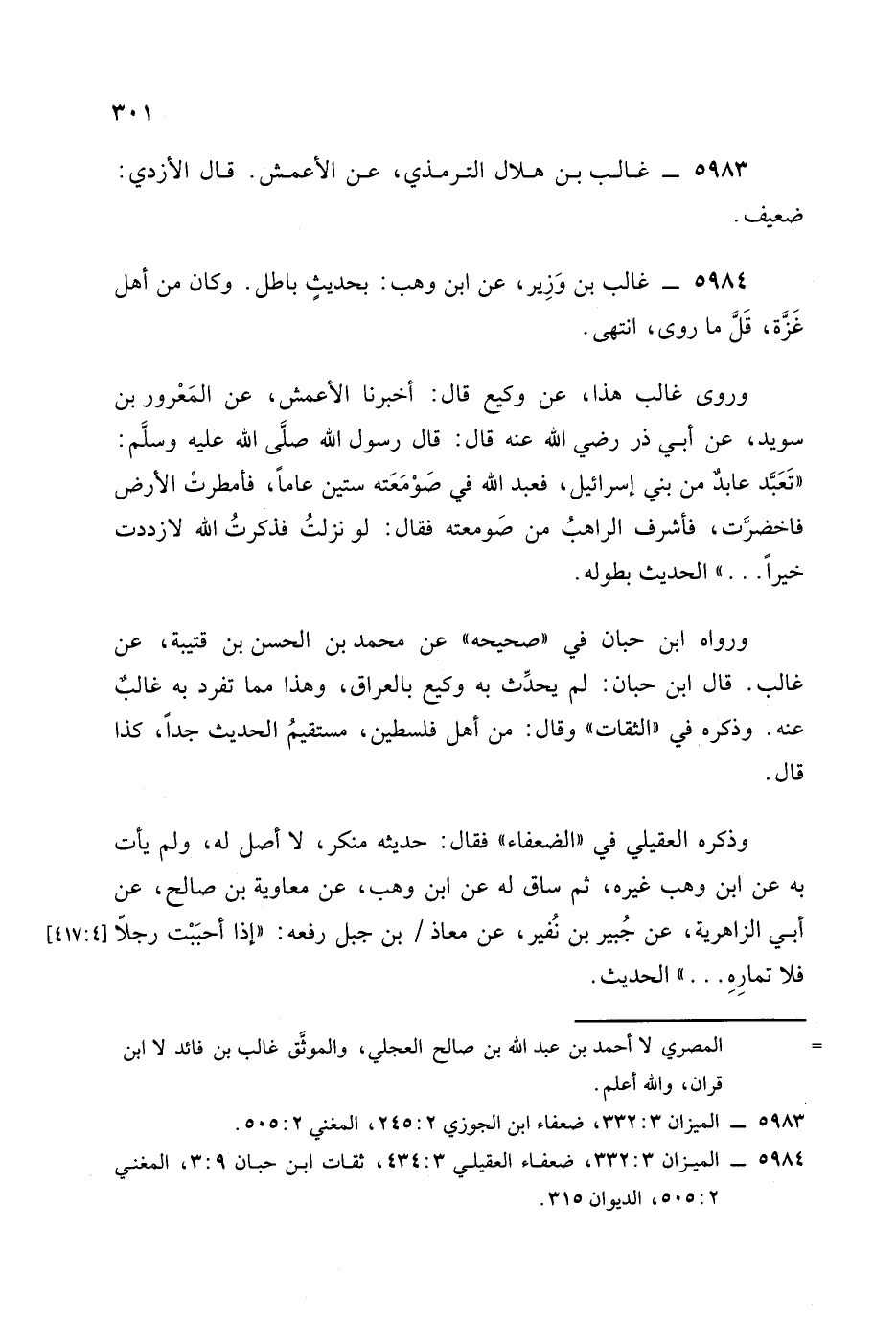 قال ابن حبان: لم يحدث به وكيع بالعراق وهذا مما تفرد به غالب عنه , وذكره في الثقات وقال: من أهل فلسطين مستقيم الحديث جدا كذا قال.