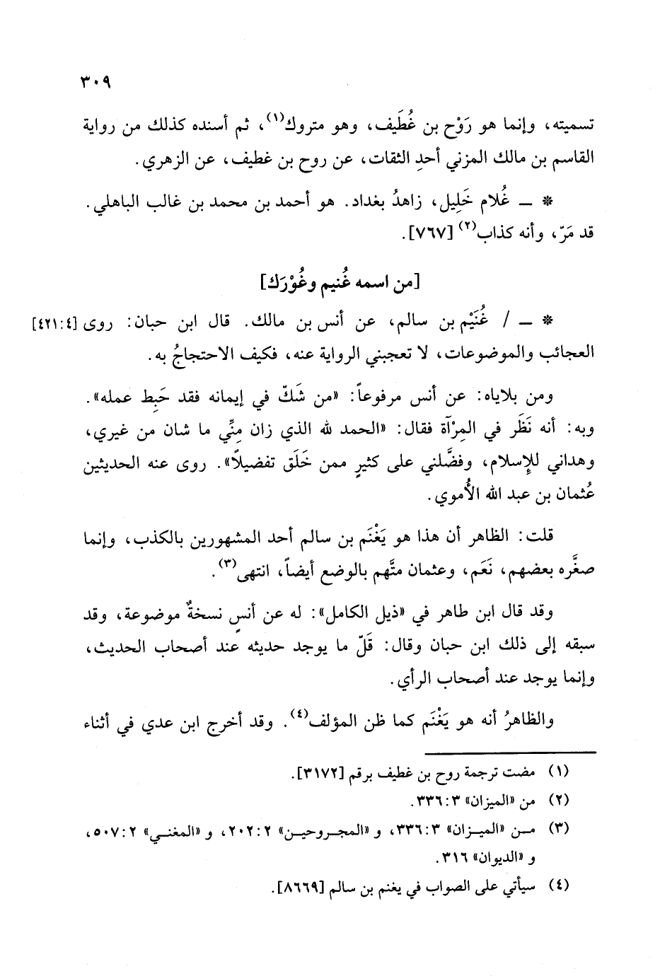 قلت: الظاهر أن هذا هو يَغْنَم بن سالم أحد المشهورين بالكذب , وإنما صغره بعضهم نَعَم , وعثمان متهم بالوضع أيضًا. انتهى.