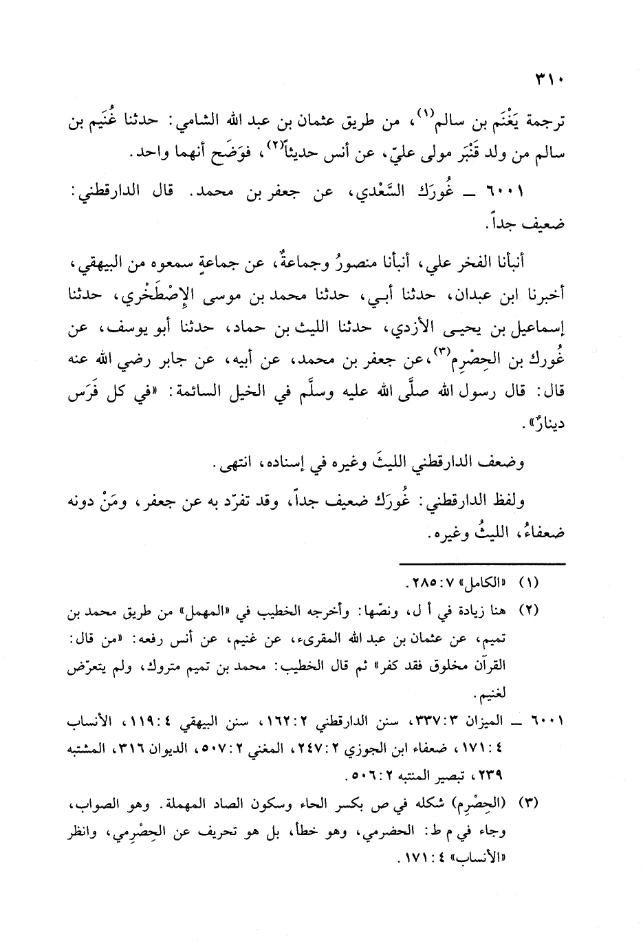 أنبأنا الفخر علي أنبأنا منصور وجماعة عن جماعة سمعوه من البيهقي أخبرنا ابن عبدان حَدَّثَنا أبي حدثنا محمد بن موسى الإصطخري حَدَّثَنا إسماعيل بن يحيى الأزدي حدثنا الليث بن حماد حَدَّثَنا أبو يوسف عن غورك بن الحِصرم عن جعفر بن محمد، عَن أبيه، عَن جَابر رضي الله عنه قال: قال رسول الله صلى الله عليه وسلم في الخيل السائمة: في كل فرس دينار.