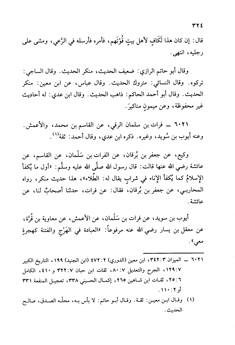 وقال ابن حبان في الثقات: فرات بن سلمان مولى عقيل من أهل الرقة يروي عن ميمون بن مهران روى عنه أهل الجزيرة مات سنة خمسين ومئة. وليس هذا بفرات بن السائب الجزري ذاك واه ضعيف.
