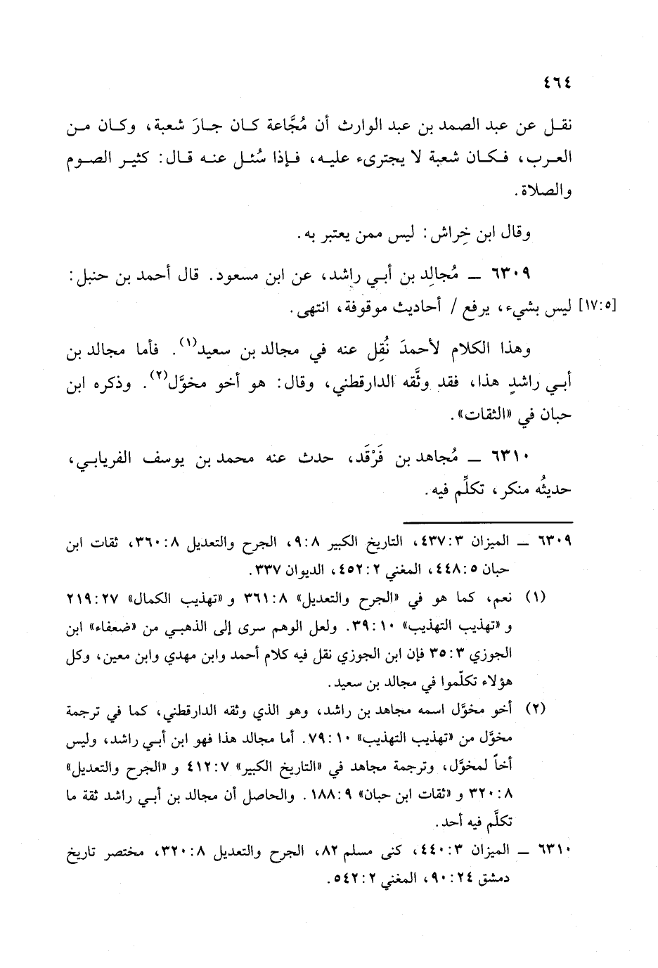 وهذا الكلام لأحمد نقل عنه في مجالد بن سعيد. فأما مجالد بن أبي راشد هذا فقد وثقه الدارقطني وقال: هو أخو مخول.