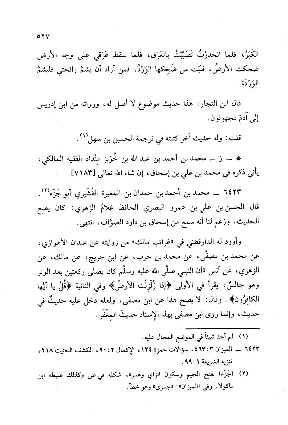 وأورد له الدارقطني في غرائب مالك من روايته عن عبدان الأهوازي، عَن مُحَمد بن مصفى، عَن مُحَمد بن حرب عن ابن جريج عن مالك، عَن الزُّهْرِيّ، عَن أنس أن النبي صلى الله عليه وسلم كان يصلى ركعتين بعد الوتر وهو جالس يقرأ في الأولى {إذا زلزت الأرض} وفي الثانية {قُلْ يَا أَيُّهَا الْكَافِرُونَ}. وقال: لا يصح هذا عن ابن مصفى ولعله دخل عليه حديث في حديث وإنما روى ابن مصفى بهذا الإسناد حديث المغفر.