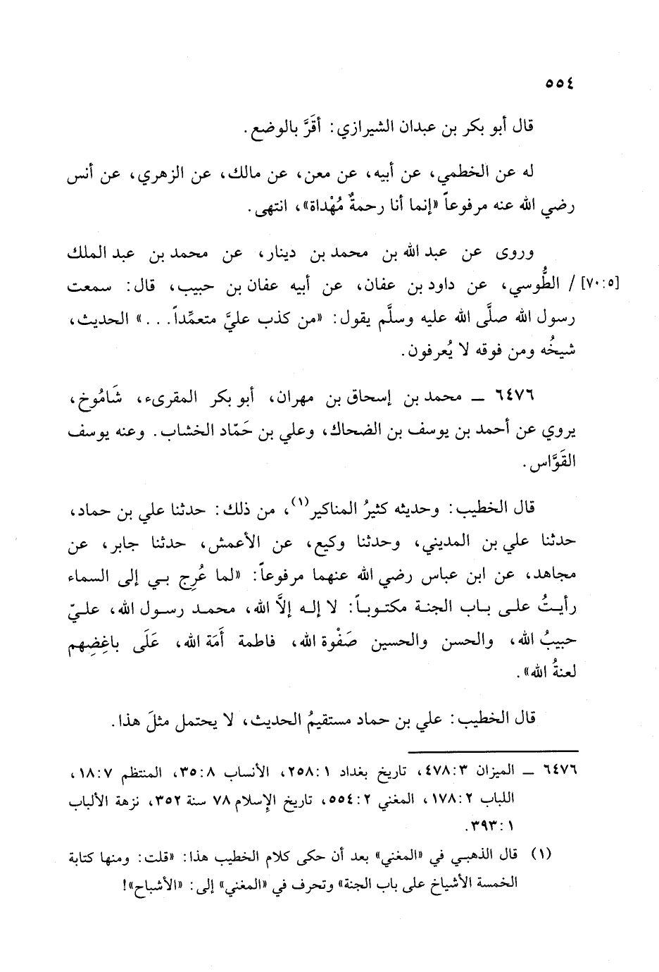 قال الخطيب: علي بن حماد مستقيم الحديث لا يحتمل مثل هذا. -[555]-