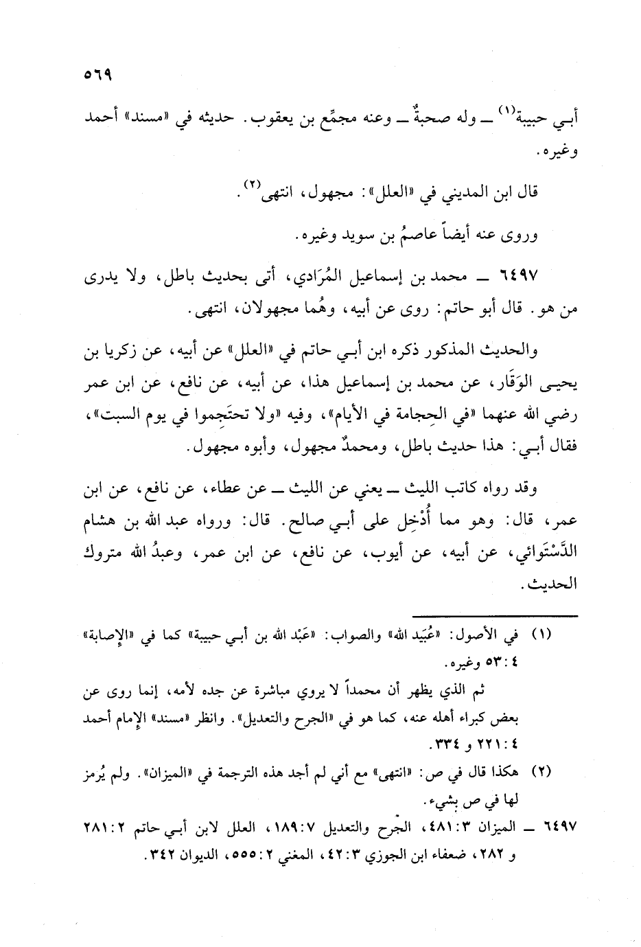 والحديث المذكور ذكره ابن أبي حاتم في العلل:، عَن أبيه، عَن زكريا بن يحيى الوقار، عَن مُحَمد بن إسماعيل هذا، عَن أبيه، عَن نافع عن ابن عمر رضي الله عنهما: في الحجامة في الأيام وفيه: وَلا تحتجموا في يوم السبت. فقال أبي: هذا حديث باطل، ومُحمد مجهول وأبوه مجهول.