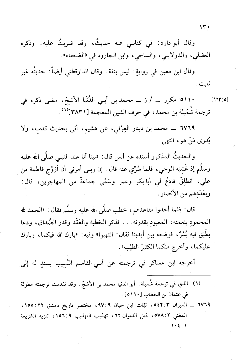 أخرجه ابن عساكر في ترجمته، عَن أبي القاسم النسيب بسند له إلى محمد بن نهار بن أبي المحياة، عَن عَبد الملك بن خيار ابن عم يحيى بن مَعِين، عَن مُحَمد هذا عن هشيم عن يونس بن عُبَيد عن الحسن، عَن أَنس. -[131]-