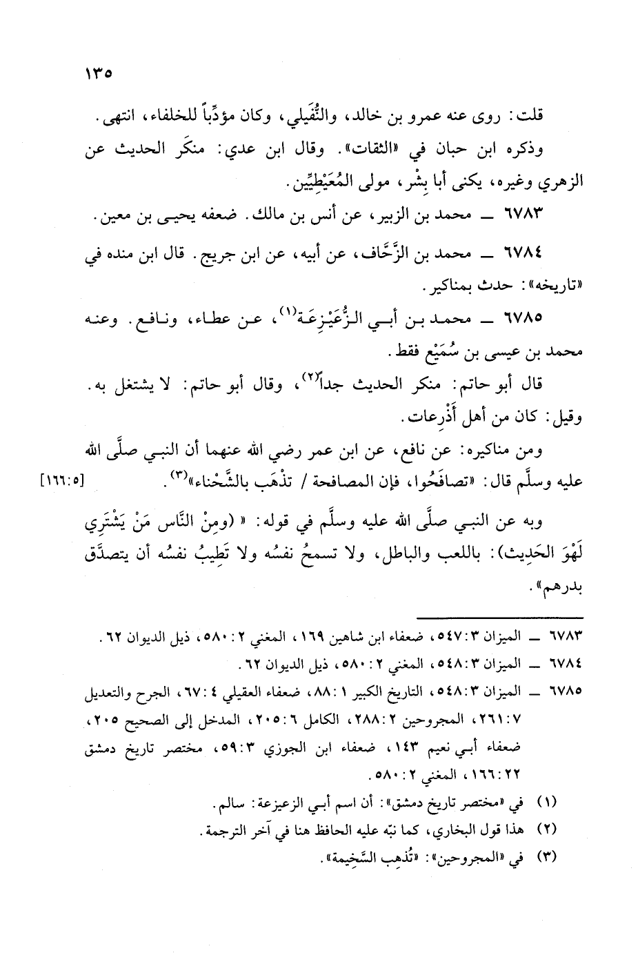 ومن مناكيره: عن نافع عن ابن عمر رضي الله عنهما أن النبي صلى الله عليه وسلم قال: تصافحوا فإن المصافحة تذهب بالشحناء.