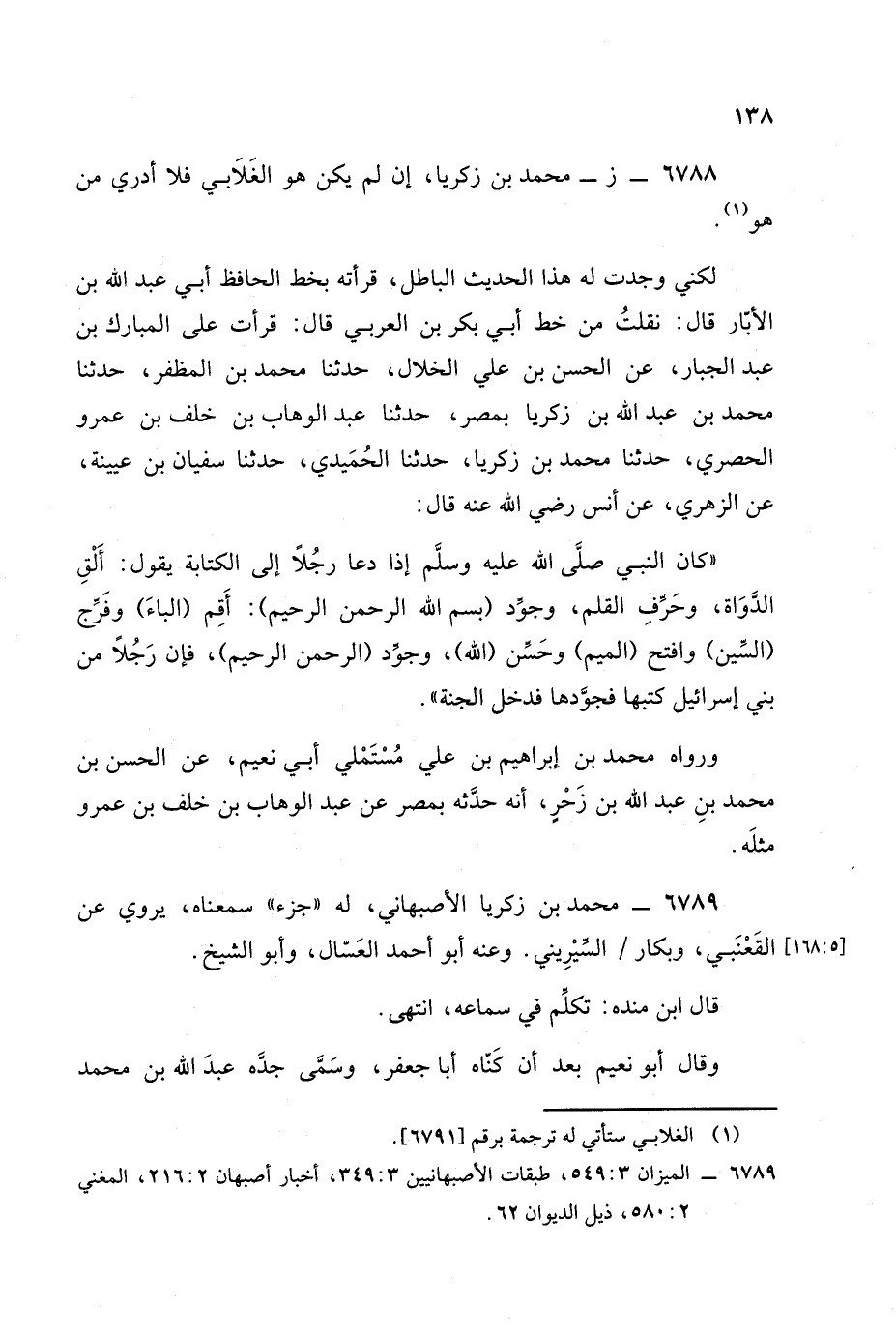 لكني وجدت له هذا الحديث الباطل قرأته بخط الحافظ أبي عبد الله بن الأبار قال: نقلت من خط أبي بكر بن العربي قال: قرأت على المبارك بن عبد الجبار عن الحسن بن علي الخلال حَدَّثَنا محمد بن المظفر حَدَّثَنا محمد بن عبد الله بن زكريا بمصر حدثنا عبد الوهاب بن خلف بن عمرو الحصري حدثنا محمد بن زكريا حَدَّثَنا الحميدي حَدَّثَنا سفيان بن عيينة، عَن الزُّهْرِيّ، عَن أنس رضي الله عنه قال: كان النبي صلى الله عليه وسلم إذا دعا رجلا إلى الكتابة يقول: ألق الدواة وحرف القلم وجود (بسم الله الرحمن الرحيم): أقم (الباء) وفرج (السين) وافتح (الميم) وحسن (الله) وجود (الرحمن الرحيم) فإن رجلا من بني إسرائيل كتبها فجودها فدخل الجنة.