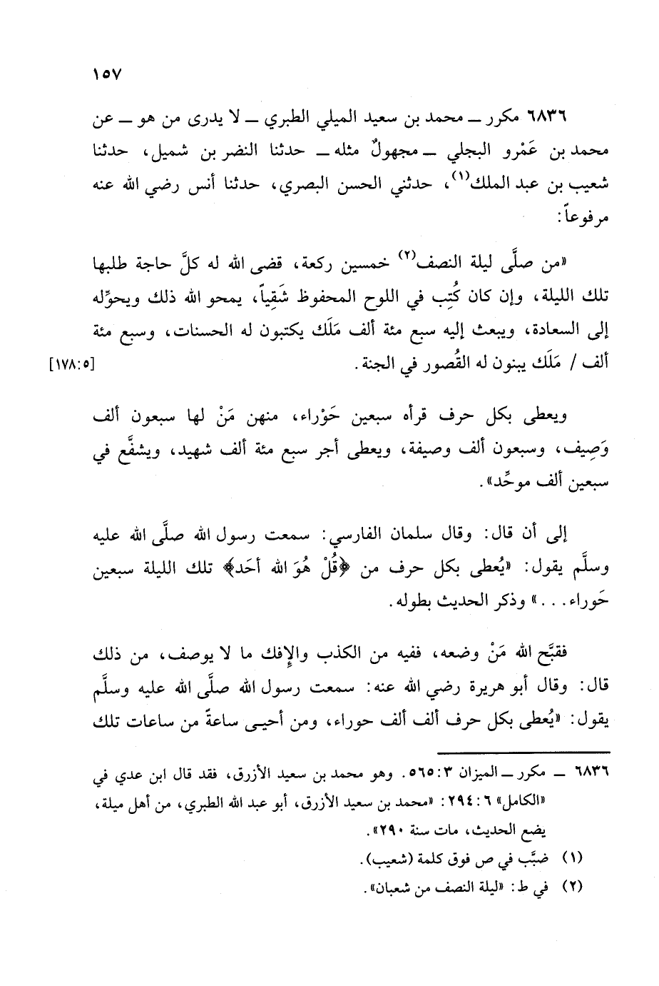 عن محمد بن عمرو البجلي - مجهول مثله - حدثنا النضر بن شميل حَدَّثَنا شعيب بن عبد الملك حدثني الحسن البصري حَدَّثَنا أنس رضي الله عنه مرفوعا: من صلى ليلة النصف خمسين ركعة قضى الله له كل حاجة طلبها تلك الليلة وإن كان كتب في اللوح المحفوظ شقيا يمحو الله ذلك ويحوله إلى السعادة ويبعث إليه سبع مِئَة ألف ملك يكتبون له الحسنات وسبع مِئَة ألف ملك يبنون له القصور في الجنة , ويعطى بكل حرف قرأه سبعين حوراء منهن من لها سبعون ألف وصيف وسبعون ألف وصيفة ويعطى أجر سبع مِئَة ألف شهيد ويشفع في سبعين ألف موحد. إلى أن قال: وقال سلمان الفارسي: سمعت رسول الله صلى الله عليه وسلم يقول: يعطى بكل حرف من {قُلْ هُوَ اللَّهُ أَحَدٌ} تلك الليلة سبعين حوراء ... وذكر الحديث بطوله.