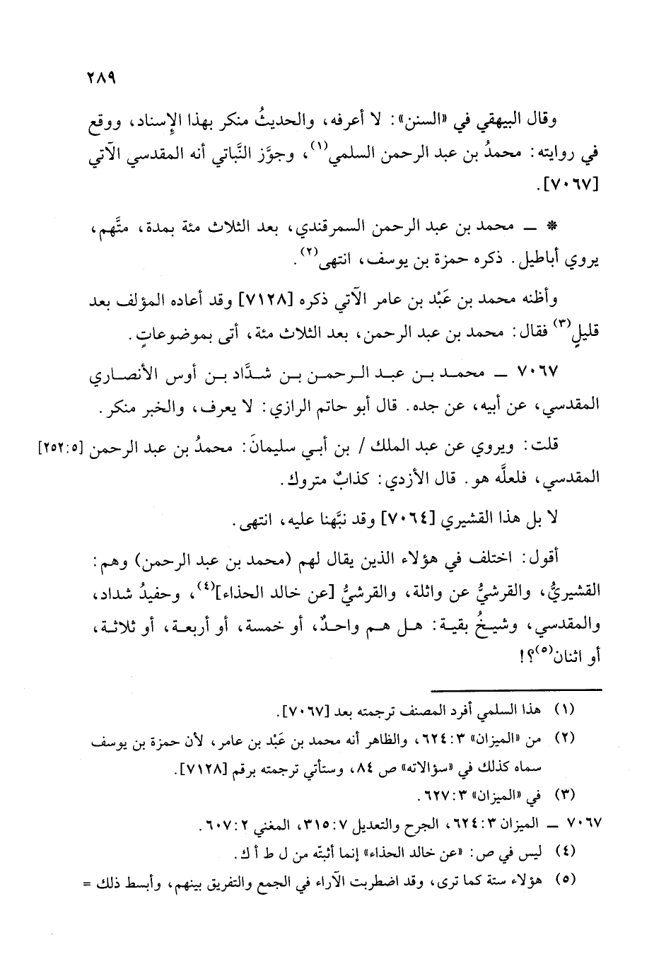 أقول: اختلف في هؤلاء الذين يقال لهم: (محمد بن عبد الرحمن) وهم: القشيري والقرشي عن واثلة والقرشي عن خالد الحذاء وحفيد شداد والمقدسي وشيخ بقية هل هم واحد، أو خمسة، أو أربعة، أو ثلاثة، أو اثنان؟!. -[291]-