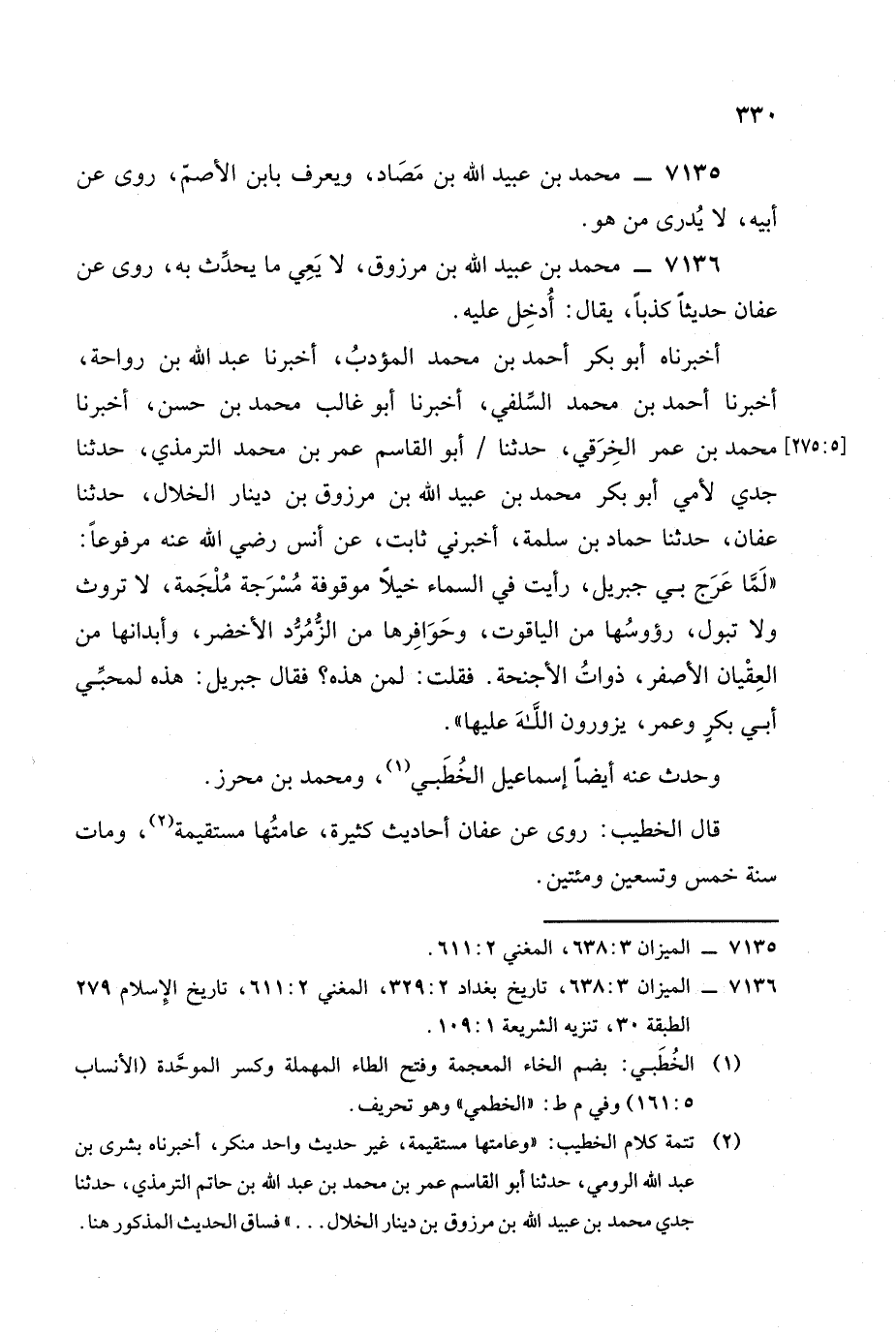أخبرناه أبو بكر أحمد بن محمد المؤدب أخبرنا عبد الله بن رواحة أخبرنا أحمد بن محمد السلفي أخبرنا أبو غالب محمد بن حسن أخبرنا محمد بن عمر الخرقي حَدَّثَنا أبو القاسم عمر بن محمد الترمذي حَدَّثَنا جدي لأمي أبو بكر محمد بن عُبَيد الله بن مرزوق بن دينار الخلال حَدَّثَنا عفان حَدَّثَنا حماد بن سلمة أخبرني ثابت، عَن أَنس رضي الله عنه مرفوعا: لما عرج بي جبريل رأيت في السماء خيلا موقوفة مسرجة ملجمة لا تروث، وَلا تبول رؤوسها من الياقوت وحوافرها من الزمرد الأخضر وأبدانها من العقيان الأصفر ذوات الأجنحة فقلت: لمن هذه؟ فقال جبريل: هذه لمحبي أبي بكر وعمر، يزورون الله عليها.