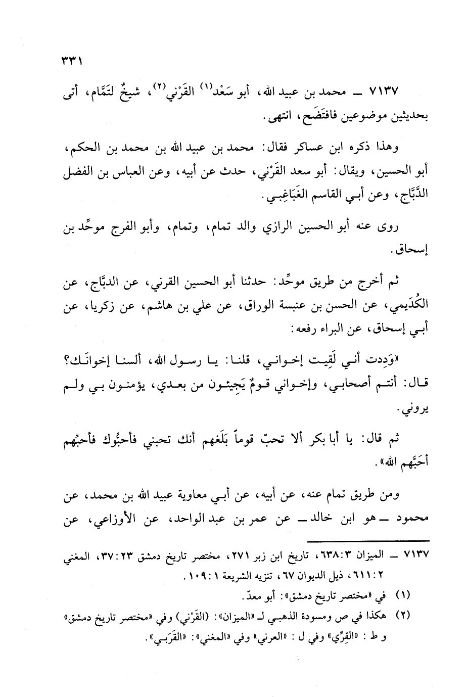 وهذا ذكره ابن عساكر فقال: محمد بن عُبَيد الله بن محمد بن الحكم أبو الحسين ويقال: أبو سعد القرني، حدث، عَن أبيه وعن العباس بن الفضل الدباج وعن أبي القاسم الغباغبي.