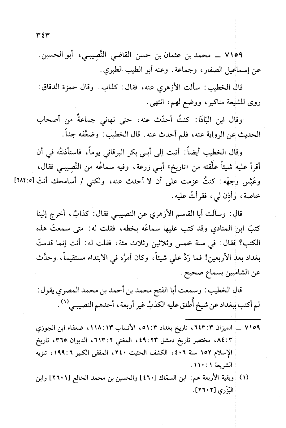 قال الخطيب: وسمعت أبا الفتح محمد بن أحمد بن محمد المصري يقول: لم أكتب ببغداد عن شيخ أطلق عليه الكذب غير أربعة أحدهم النصيبي. -[344]-
