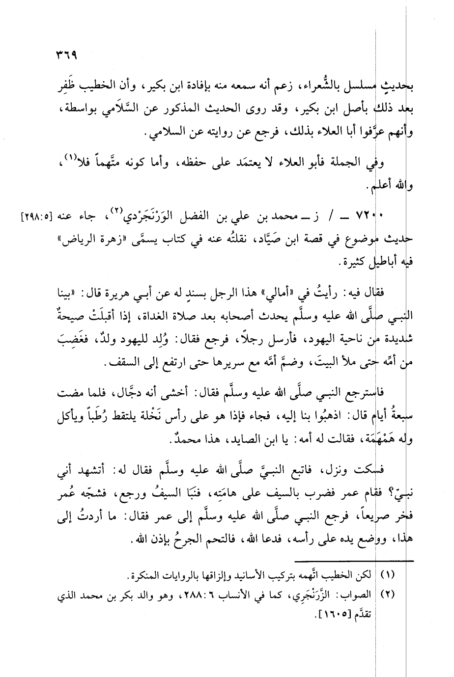 جاء عنه حديث موضوع في قصة ابن صياد نقلته عنه في كتاب يسمى "زهر الرياض" فيه أباطيل كثيرة.