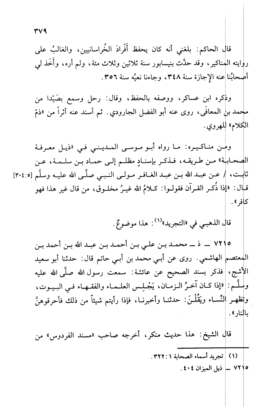 رَوَى عَن أبي محمد بن أبي حاتم قال: حدثنا أبو سعيد الأشج فذكر بسند الصحيح عن عائشة: سمعت رسول الله صلى الله عليه وسلم: إذا كان آخر الزمان يجلس العلماء والفقهاء في البيوت وتظهر النساء ويقلن: حدثنا وأخبرنا فإذا رأيتم شيئا من ذلك فأحرقوهن بالنار.