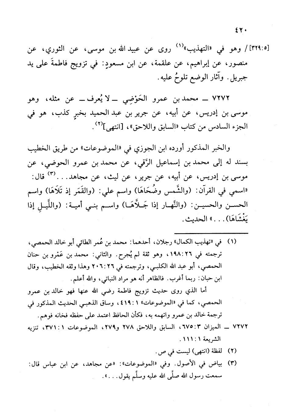 والخبر المذكور أورده ابن الجوزي في الموضوعات من طريق الخطيب بسند له إلى محمد بن إسماعيل الرقي، عَن مُحَمد بن عمرو الحوضي عن موسى بن إدريس، عَن أبيه، عن جرير عن ليث عن مجاهد ... قال: اسمي في القرآن: (والشمس وضحاها) واسم علي: (والقمر إذا تلاها) واسم الحسن والحسين: (والنهار إذا جلاها) واسم بني أمية: (والليل إذا يغشاها) ... الحديث.