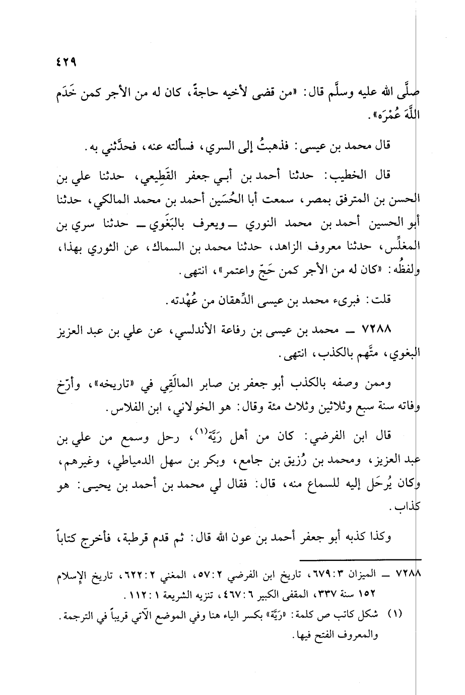 وكذا كذبه أبو جعفر أحمد بن عون الله , قال: ثم قدم قرطبة فأخرج كتابا من حديث سفيان بن عيينة، عَن الزُّهْرِيّ، عَن أنس كله. -[430]-