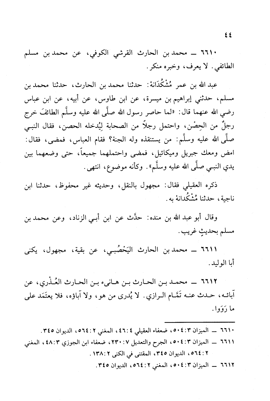 عبد الله بن عمر مشكدانة: حدثنا محمد بن الحارث حدثنا محمد بن مسلم حدثني إبراهيم بن ميسرة عن ابن طاوُوس، عَن أبيه، عَن ابن عباس رضي الله عنهما قال: لما حاصر رسول الله صلى الله عليه وسلم الطائف خرج رجل من الحصن واحتمل رجلا من الصحابة ليدخله الحصن فقال النبي صلى الله عليه وسلم من يستنقذه وله الجنة؟ فقام العباس فمضى فقال: امض ومعك جبريل وميكائيل فمضى واحتملهما جميعا حتى وضعهما بين يدي النبي صلى الله عليه وسلم. وكأنه موضوع. انتهى.