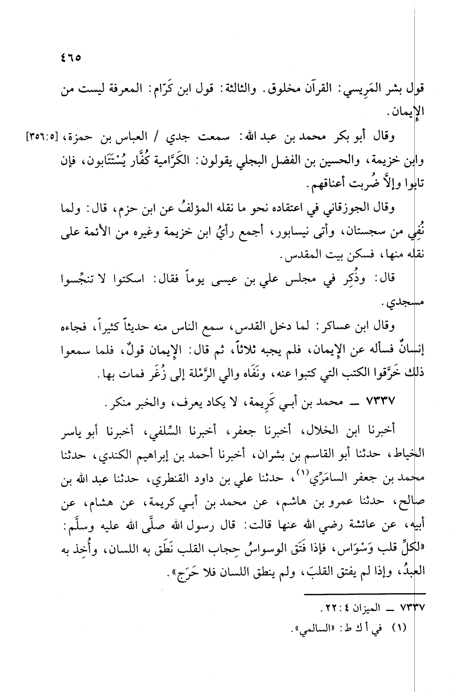 أخبرنا ابن الخلال أخبرنا جعفر أخبرنا السلفي أخبرنا أبو ياسر الخياط حدثنا أبو القاسم بن بشران أخبرنا أحمد بن إبراهيم الكندي حدثنا محمد بن جعفر السامري حدثنا علي بن داود القنطري حدثنا عبد الله بن صالح حَدَّثَنا عمرو بن هاشم، عَن مُحَمد بن أبي كريمة عن هشام، عَن أبيه، عَن عائشة رضي الله عنها قالت: قال رسول الله صلى الله عليه وسلم: لكل قلب وسواس فإذا فتق الوسواس حجاب القلب نطق به اللسان وأخذ به العبد، وَإذا لم يفتق القلب ولم ينطق اللسان فلا حرج.