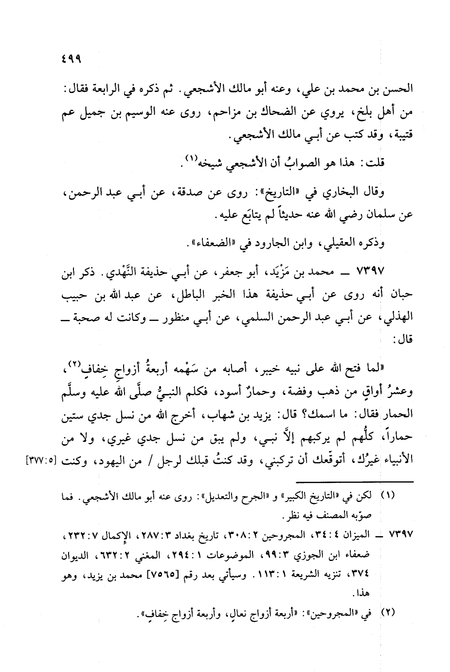ذكر ابن حبان أنه روى، عَن أبي حذيفة هذا الخبر الباطل: عَن عَبد الله بن حبيب الهذلي، عَن أبي عبد الرحمن السلمي، عَن أبي منظور - وكانت له صحبة - قال: لما فتح الله على نبيه خيبر أصابه من سهمه أربعة أزواج خفاف وعشر أواق من ذهب وفضة وحمار أسود فكلم النبي صلى الله عليه وسلم الحمار فقال: ما اسمك؟ قال: يزيد بن شهاب أخرج الله من نسل جدي ستين حمارا كلهم لم يركبهم إلا نبي ولم يبق من نسل جدي غيري، وَلا من الأنبياء غيرك أتوقعك أن تركبني وقد كنت قبلك لرجل من اليهود وكنت أعثر به عمدا وكان يجيع بطني ويضرب ظهري فقال له النبي صلى الله عليه وسلم: قد سميتك يعفورا يا يعفور أتشتهي الإناث قال: لا. -[500]-