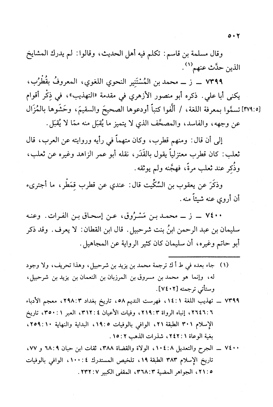7399 - (ز): محمد بن المستنير النحوي اللغوي المعروف بقطرب يكنى أبا علي.