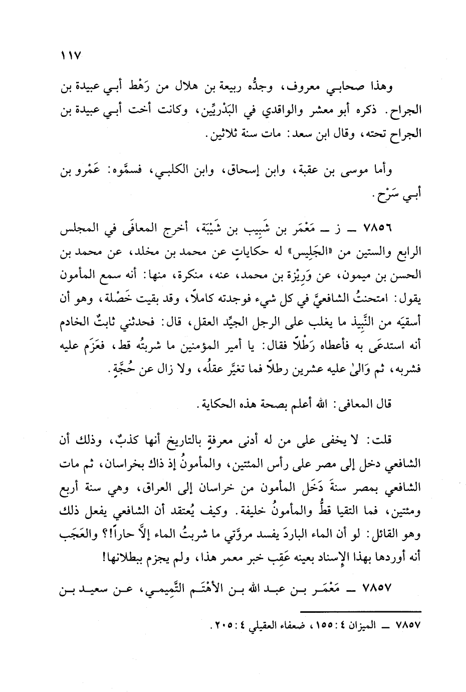 قلت: لا يخفى على من له أدنى معرفة بالتاريخ أنها كذب وذلك أن الشافعي دخل إلى مصر على رأس المئتين والمأمون إذ ذاك بخراسان ثم مات الشافعي بمصر سنة دخل المأمون من خراسان إلى العراق وهي سنة أربع ومئتين فما التقيا قط والمأمون خليفة. وكيف يعتقد أن الشافعي يفعل ذلك وهو القائل: لو أن الماء البارد يفسد مروتي ما شربت الماء إلا حارا؟! والعجب أنه أوردها بهذا الإسناد بعينه عقب خبر معمر هذا ولم يجزم ببطلانها!.