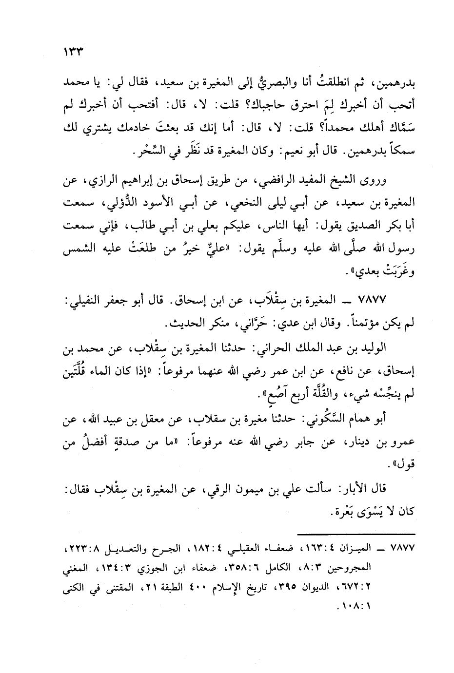 وقال ابن عَدِي: يكنى أبا بشر مولى محمد بن مروان. ثم أخرج له حديث القلتين وأورده عنه بلفظ فرقان وزاد: من قلال هجر , وقال: قوله "من قلال هجر" غير محفوظ ولم يذكر إلا في هذا، وَابن إسحاق إنما يرويه عن ابن عبد الله بن عمر، عَن أبيه فترك المغيرة هذا الطريق وقال: عن نافع عن ابن عمر كأنه أسهل عليه.