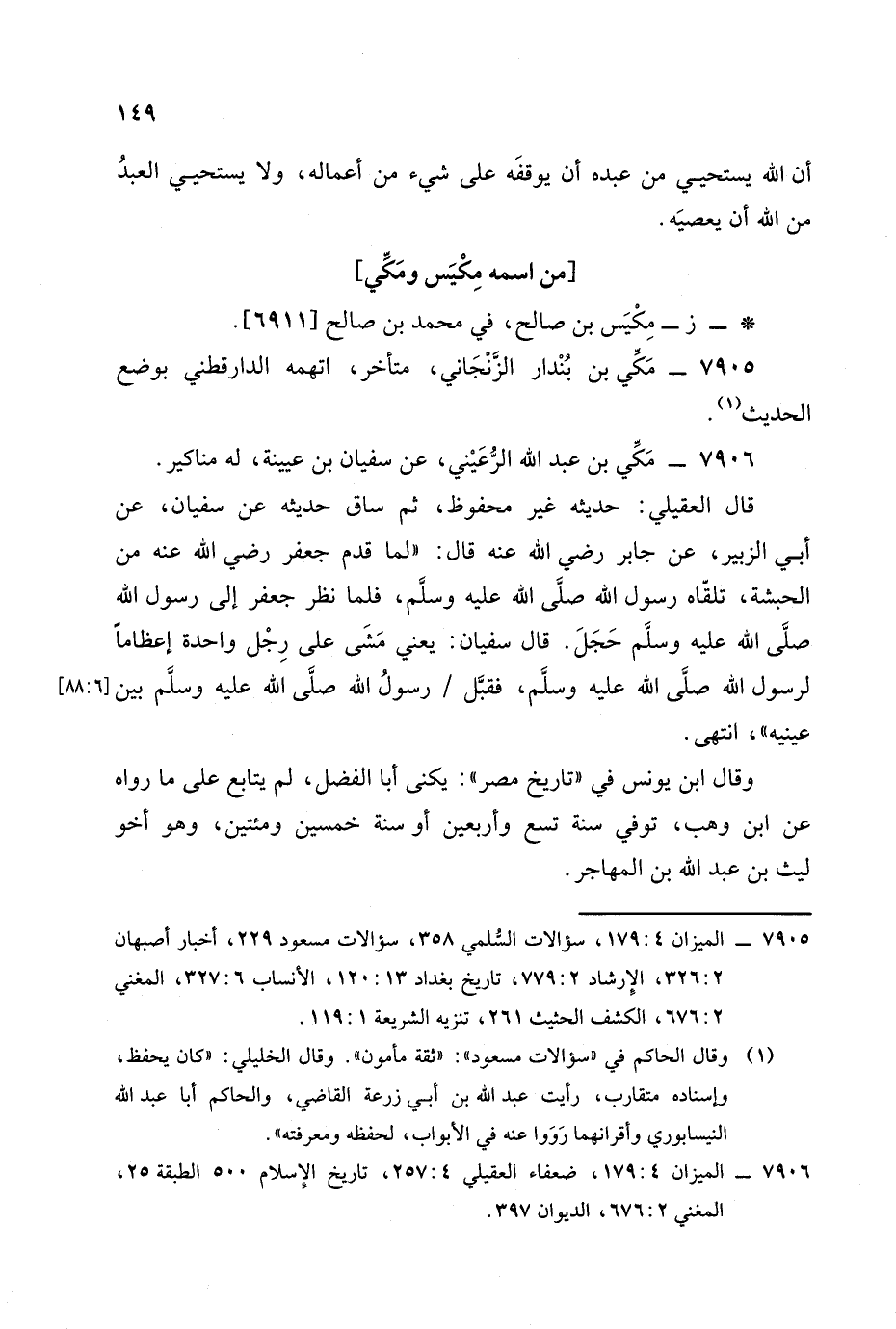 قال العقيلي: حديثه غير محفوظ. ثم ساق حديثه عن سفيان، عَن أبي الزبير، عَن جَابر رضي الله عنه قال: لما قدم جعفر رضي الله عنه من الحبشة تلقاه رسول الله صلى الله عليه وسلم فلما نظر جعفر إلى رسول الله صلى الله عليه وسلم حجل، قال سفيان: يعني مشى على رجل واحدة إعظاما لرسول الله صلى الله عليه وسلم فقبل رسول الله صلى الله عليه وسلم بين عينيه. انتهى.
