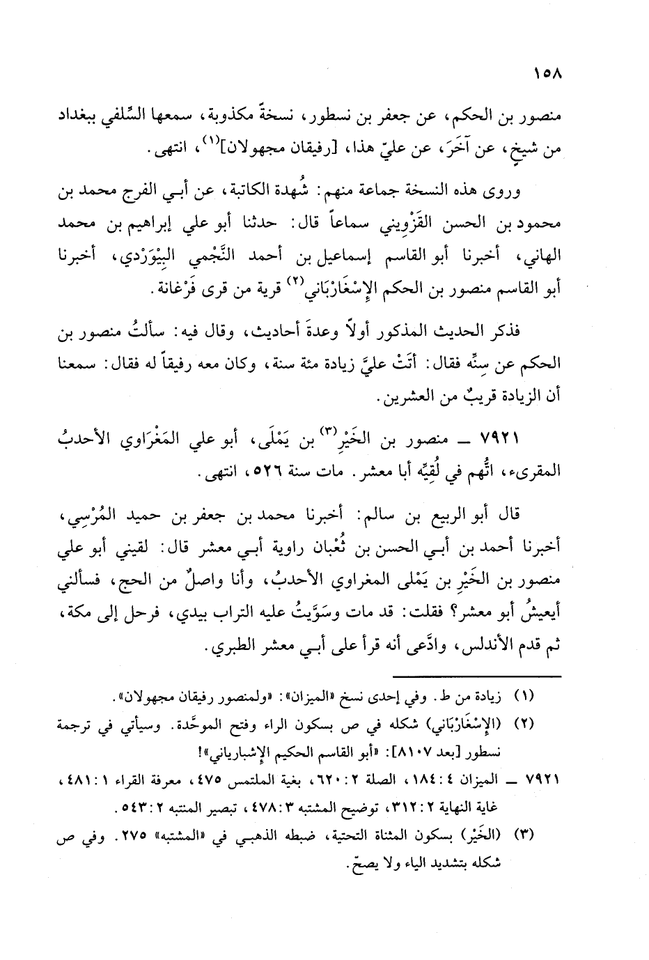 قال: وأبو علي منصور هذا قد وثقه الأشياخ , منهم أبو بكر بن رزق وصححوا روايته وأخبرني أبو القاسم السهيلي أنه وقف على إجازة أبي معشر لأبي علي منصور عند بعض أهل مالقة قال: وقد رحل إليه أبو عبد الله النميري وتلا عليه القرآن فأقره عليه ابن الباذش ولم يتهمه بشيء من روايته، وَلا أشك أن النميري أتم معرفة ونقدا من ابن الباذش.