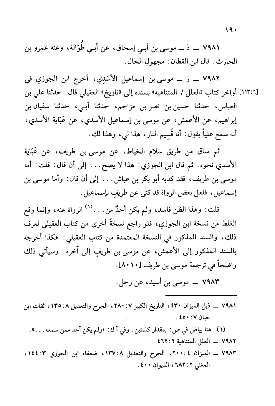 قلت: وهذا الظن فاسد ولم يكن أحد من ... الرواة عنه وإنما وقع الغلط من نسخة ابن الجوزي فلو راجع نسخة أخرى من كتاب العقيلي لعرف ذلك والسند المذكور في النسخة المعتمدة من كتاب العقيلي: هكذا أخرجه بالسند المذكور إلى الأعمش عن موسى بن طريف إلى آخره. وسيأتي ذلك واضحا في ترجمة موسى بن طريف [8010].
