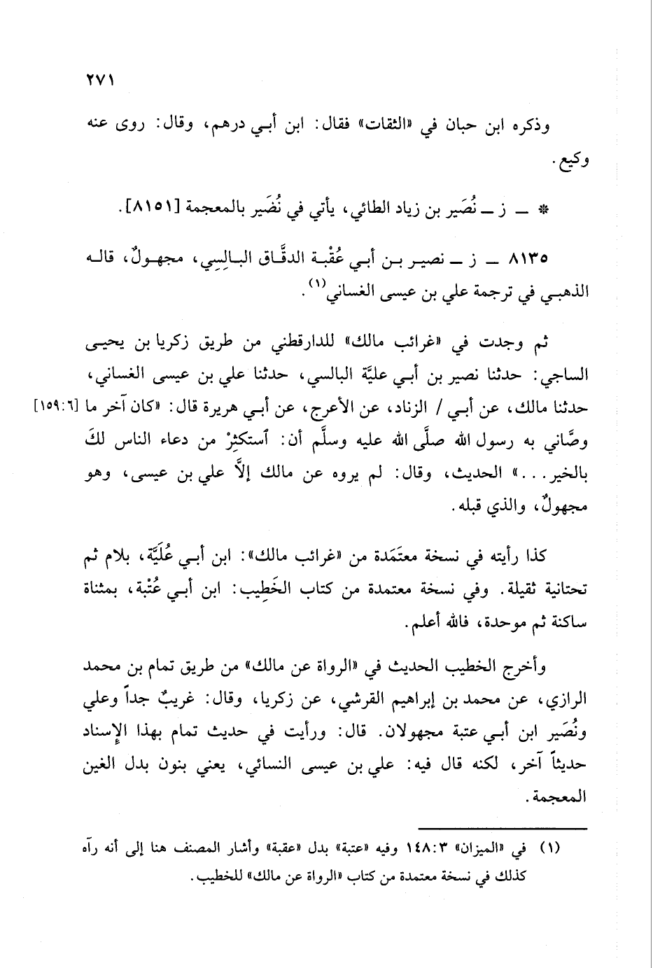 وأخرج الخطيب الحديث في الرواة عن مالك من طريق تمام بن محمد الرازي، عَن مُحَمد بن إبراهيم القرشي عن زكريا وقال: غريب جدا وعلي ونصير بن أبي عتبة مجهولان , قال: ورأيت في حديث تمام بهذا الإسناد حديثا آخر لكنه قال فيه: علي بن عيسى النسائي يعني بنون بدل الغين المعجمة.