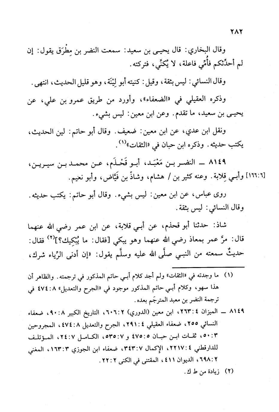شاذ: حَدَّثَنا أبو قحذم، عَن أبي قلابة عن ابن عمر رضي الله عنهما قال: مر عمر بمعاذ رضي الله عنهما وهو يبكي فقال: ما يبكيك؟ فقال حديث سمعته من النبي صلى الله عليه وسلم يقول: إن أدنى الرياء شرك وأحب العباد إلى الله الأتقياء الأخفياء الذين إذا غابوا لم يفتقدوا أولئك أئمة الهدى ومصابيح الظُّلَم , انتهى. -[283]-