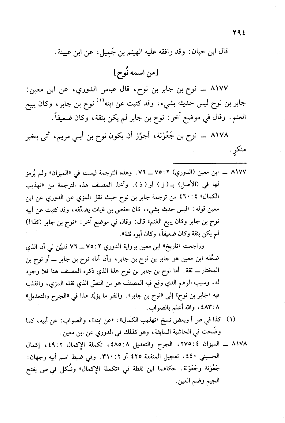 قلت: وليس ما قاله الحسيني بجيد لأن عبارة ابن حبان: نوح بن ربيعة فذكر كلاما ثم قال: وقد قيل: أبو نوح بن جعونة إلى آخر ما قاله الحسيني , فهذا كما ترى لم يعرج ابن حبان على نوح بن جعونة وأنا أظن قوله "أبو" تصحيف وإنما هي "إنه".