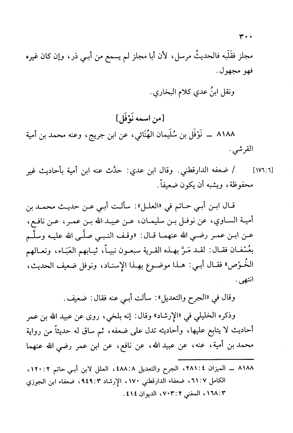 قال ابن أبي حاتم في العلل: سألت أبي عن حديث محمد بن أمية الساوي عن نوفل بن سليمان عن عُبَيد الله بن عمر عن نافع عن ابن عمر رضي الله عنهما قال: وقف النبي صلى الله عليه وسلم بعسفان فقال: لقد مر بهذه القرية سبعون نبيا ثيابهم العباء ونعالهم الخوص. فقال أبي: هذا موضوع بهذا الإسناد ونوفل ضعيف الحديث. انتهى.