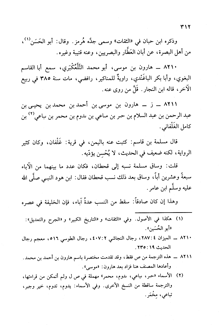 8211 - (ز): هارون بن موسى بن أحمد بن محمد بن يحيى بن عبد الرحمن بن عبد السلام بن حر بن ماعي بن ـدوم بن محمر بن ـباعي بن كامل الغلفاني. (1)