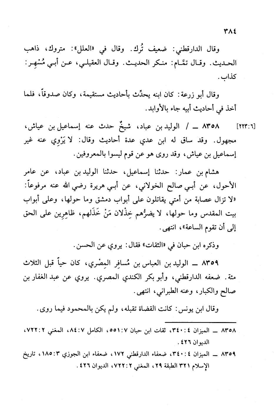 هشام بن عمار: حدثنا إسماعيل حَدَّثَنا الوليد بن عباد عن عامر الأحول، عَن أبي صالح الخولاني، عَن أبي هريرة رضي الله عنه مرفوعا: لا تزال عصابة من أمتي يقاتلون على أبواب دمشق وما حولها وعلى أبواب بيت المقدس وما حولها لا يضرهم خذلان من خذلهم ظاهرين على الحق إلى أن تقوم الساعة. انتهى.