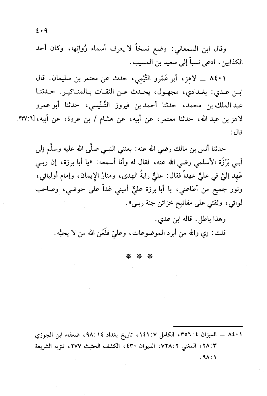 حدثنا عبد الملك بن محمد حَدَّثَنا أحمد بن فيروز التنيسي حَدَّثَنا أبو عمرو , لاهز بن عبد الله حَدَّثَنا معتمر، عَن أبيه، عَن هشام بن عروة، عَن أبيه قال: حدثنا أنس بن مالك رضي الله عنه: بعثني النبي صلى الله عليه وسلم إلى أبي برزة الأسلمي رضي الله عنه فقال له وأنا أسمعه: يا أبا برزة إن ربي عهد إلي في علي عهدا فقال: علي راية الهدى ومنار الإيمان وإمام أوليائي ونور جميع من أطاعني، يا أبا برزة علي أميني غدا على حوضي وصاحب لوائي وثقتي على مفاتيح خزائن جنة ربي. وهذا باطل قاله ابن عَدِيّ.